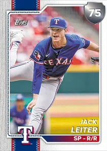 This is the Live card for Jack Leiter, featured in MLB The Show 26. He's a 75 Overall Silver card primarily playing SP. Available on the marketplace for around 60 stubs (buy now price). Jack Leiter has a elite Meta Score of 71.60, indicating his overall effectiveness in competitive play. On the mound, Jack Leiter exhibits average H/9 with a 68 rating, below average K/9 with a 58 rating, and below average BB/9 with a 52 rating. His overall pitching profile is defined by average control with a Control rating of 63, elite velocity with a Velocity rating of 99, and great break with a Break rating of 88. He utilizes a 5-pitch mix, spearheaded by a 4-Seam Fastball, complemented by a Slider. Key pitches include: 4-Seam Fastball, Slider, Circle Change, Sinker, 12-6 Curve. Jack Leiter is a 25-year-old baseball player, stands 6'1" and weighs 205 lbs, born in Florida, currently playing for the Rangers, bats R and throws R. Other available versions for Jack Leiter include: Color Storm (92 Diamond), Live (77 Silver).