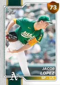 This is the Live card for Jacob Lopez, featured in MLB The Show 26. He's a 73 Overall Bronze card primarily playing SP. Available on the marketplace for around 61 stubs (sell now price). Jacob Lopez has a elite Meta Score of 69.29, indicating his overall effectiveness in competitive play. On the mound, Jacob Lopez exhibits average H/9 with a 68 rating, average K/9 with a 66 rating, and below average BB/9 with a 56 rating. His overall pitching profile is defined by below average control with a Control rating of 59, average velocity with a Velocity rating of 67, and good break with a Break rating of 76. He utilizes a 5-pitch mix, spearheaded by a 4-Seam Fastball, complemented by a Slider. Key pitches include: 4-Seam Fastball, Slider, Cutter, Circle Change, Sinker. Jacob Lopez is a 28-year-old baseball player, stands 6'4" and weighs 220 lbs, born in California, currently playing for the Athletics, bats L and throws L. Other available versions for Jacob Lopez include: Live (74 Bronze).
