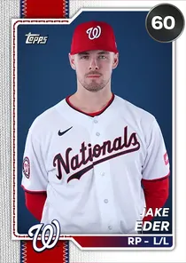 This is the Live card for Jake Eder, featured in MLB The Show 26. He's a 60 Overall Common card primarily playing RP. Available on the marketplace for around 9 stubs (buy now price). Jake Eder has a elite Meta Score of 57.82, indicating his overall effectiveness in competitive play. On the mound, Jake Eder exhibits below average H/9 with a 54 rating, below average K/9 with a 52 rating, and average BB/9 with a 60 rating. His overall pitching profile is defined by below average control with a Control rating of 53, average velocity with a Velocity rating of 68, and good break with a Break rating of 77. He utilizes a 4-pitch mix, spearheaded by a 4-Seam Fastball, complemented by a Slider. Key pitches include: 4-Seam Fastball, Slider, Sweeper, Circle Change. Jake Eder is a 27-year-old baseball player, stands 6'4" and weighs 225 lbs, born in Florida, currently playing for the Nationals, bats L and throws L. Other available versions for Jake Eder include: Live (65 Bronze).