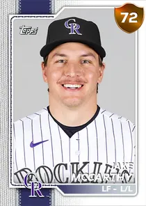 This is the Live card for Jake McCarthy, featured in MLB The Show 26. He's a 72 Overall Bronze card primarily playing LF. He can also fill in at CF, RF. Available on the marketplace for around 198 stubs (buy now price). Jake McCarthy has a elite Meta Score of 65.58, indicating his overall effectiveness in competitive play. At the plate, Jake McCarthy displays average contact overall, with specific ratings of 63 Contact vs Right and 65 Contact vs Left. He brings below average power to the plate, evident from his 44 Power vs Right and 25 Power vs Left. In terms of plate discipline, his good Vision stands at 76, paired with his below average Discipline rating of 45. In the field, Jake McCarthy is a good defender. His key defensive attributes are 79 Fielding, 49 Arm Strength, and 73 Reaction time. On the basepaths, Jake McCarthy showcases elite speed and good stealing ability. This is supported by 98 Speed, a 70 Stealing rating, and 72 Baserunning Aggression. Jake McCarthy is a 28-year-old baseball player, stands 6'1" and weighs 215 lbs, born in Pennsylvania, currently playing for the Rockies, bats L and throws L. Other available versions for Jake McCarthy include: Live (75 Silver).