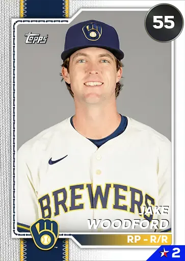 This is the Live card for Jake Woodford, featured in MLB The Show 26. He's a 55 Overall Common card primarily playing RP. Available on the marketplace for around 392 stubs (buy now price). Jake Woodford has a elite Meta Score of 55.39, indicating his overall effectiveness in competitive play. On the mound, Jake Woodford exhibits below average H/9 with a 31 rating, below average K/9 with a 38 rating, and good BB/9 with a 75 rating. His overall pitching profile is defined by average control with a Control rating of 60, great velocity with a Velocity rating of 85, and elite break with a Break rating of 91. He utilizes a 5-pitch mix, spearheaded by a Sinker, complemented by a Circle Change. Key pitches include: Sinker, Circle Change, Sweeper, 4-Seam Fastball, Cutter. Jake Woodford is a 29-year-old baseball player, stands 6'4" and weighs 215 lbs, born in Florida, currently playing for the Brewers, bats R and throws R. Other available versions for Jake Woodford include: Live (58 Common).