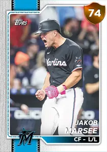 This is the Live card for Jakob Marsee, featured in MLB The Show 26. He's a 74 Overall Bronze card primarily playing CF. He can also fill in at LF, RF. Available on the marketplace for around 185 stubs (buy now price). Jakob Marsee has a elite Meta Score of 69.07, indicating his overall effectiveness in competitive play. At the plate, Jakob Marsee displays good contact overall, with specific ratings of 67 Contact vs Right and 72 Contact vs Left. He brings below average power to the plate, evident from his 40 Power vs Right and 51 Power vs Left. In terms of plate discipline, his below average Vision stands at 56, paired with his below average Discipline rating of 54. In the field, Jakob Marsee is a good defender. His key defensive attributes are 76 Fielding, 77 Arm Strength, and 74 Reaction time. On the basepaths, Jakob Marsee showcases average speed and below average stealing ability. This is supported by 68 Speed, a 56 Stealing rating, and 75 Baserunning Aggression. Jakob Marsee is a 24-year-old baseball player, stands 6'0" and weighs 180 lbs, born in Michigan, currently playing for the Marlins, bats L and throws L. Other available versions for Jakob Marsee include: Spotlight (99 Diamond), Topps Now (97 Diamond), Live (75 Silver).