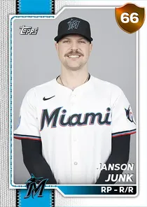 This is the Live card for Janson Junk, featured in MLB The Show 26. He's a 66 Overall Bronze card primarily playing RP. Available on the marketplace for around 135 stubs (buy now price). Janson Junk has a elite Meta Score of 62.90, indicating his overall effectiveness in competitive play. On the mound, Janson Junk exhibits below average H/9 with a 53 rating, below average K/9 with a 46 rating, and elite BB/9 with a 98 rating. His overall pitching profile is defined by average control with a Control rating of 61, good velocity with a Velocity rating of 71, and good break with a Break rating of 79. He utilizes a 5-pitch mix, spearheaded by a 4-Seam Fastball, complemented by a Slider. Key pitches include: 4-Seam Fastball, Slider, Sweeper, 12-6 Curve, Circle Change. Janson Junk is a 30-year-old baseball player, stands 6'2" and weighs 197 lbs, born in Washington, currently playing for the Marlins, bats R and throws R. Active Quirks for Janson Junk: Road Warrior. Other available versions for Janson Junk include: Live (74 Bronze).