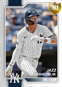 This is the Live card for Jazz Chisholm Jr., featured in MLB The Show 26. He's a 81 Overall Gold card primarily playing 2B. He can also fill in at 3B. Available on the marketplace for around 697 stubs (sell now price). Jazz Chisholm Jr. has a elite Meta Score of 71.10, indicating his overall effectiveness in competitive play. At the plate, Jazz Chisholm Jr. displays average contact overall, with specific ratings of 69 Contact vs Right and 64 Contact vs Left. He brings good power to the plate, evident from his 88 Power vs Right and 66 Power vs Left. In terms of plate discipline, his below average Vision stands at 52, paired with his average Discipline rating of 69. In the field, Jazz Chisholm Jr. is a great defender. His key defensive attributes are 82 Fielding, 56 Arm Strength, and 72 Reaction time. On the basepaths, Jazz Chisholm Jr. showcases average speed and great stealing ability. This is supported by 60 Speed, a 84 Stealing rating, 0 Baserunning Ability, and 89 Baserunning Aggression. Jazz Chisholm Jr. is a 28-year-old baseball player, stands 5'11" and weighs 184 lbs, born in Bahamas, currently playing for the Yankees, bats L and throws R. Other available versions for Jazz Chisholm Jr. include: 2025 Finest (99 Diamond), Spotlight (96 Diamond), 2025 Home Run Derby (96 Diamond), Egg Hunt (89 Diamond), World Baseball Classic (87 Diamond), Live (84 Gold).