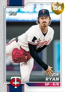 This is the Live card for Joe Ryan, featured in MLB The Show 26. He's a 84 Overall Gold card primarily playing SP. Available on the marketplace for around 1,563 stubs (buy now price). Joe Ryan has a elite Meta Score of 81.82, indicating his overall effectiveness in competitive play. On the mound, Joe Ryan exhibits good H/9 with a 76 rating, average K/9 with a 68 rating, and great BB/9 with a 84 rating. His overall pitching profile is defined by average control with a Control rating of 66, great velocity with a Velocity rating of 87, and elite break with a Break rating of 93. As a starting pitcher, his stamina is great with a rating of 83. He utilizes a 5-pitch mix, spearheaded by a 4-Seam Fastball, complemented by a Sweeper. Key pitches include: 4-Seam Fastball, Sweeper, Sinker, Splitter, Slider. Joe Ryan is a 29-year-old baseball player, stands 6'2" and weighs 205 lbs, born in California, currently playing for the Twins, bats R and throws R. Active Quirks for Joe Ryan: Break Outlier. Other available versions for Joe Ryan include: 2025 Finest (99 Diamond), 2025 All-Star (96 Diamond), Live (85 Diamond).
