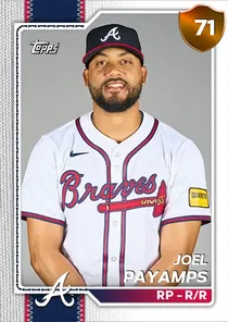 This is the Live card for Joel Payamps, featured in MLB The Show 26. He's a 71 Overall Bronze card primarily playing RP. Available on the marketplace for around 45 stubs (sell now price). Joel Payamps has a elite Meta Score of 70.53, indicating his overall effectiveness in competitive play. On the mound, Joel Payamps exhibits average H/9 with a 64 rating, below average K/9 with a 56 rating, and good BB/9 with a 78 rating. His overall pitching profile is defined by good control with a Control rating of 71, elite velocity with a Velocity rating of 98, and elite break with a Break rating of 96. He utilizes a 4-pitch mix, spearheaded by a Slider, complemented by a 4-Seam Fastball. Key pitches include: Slider, 4-Seam Fastball, Sinker, Circle Change. Joel Payamps is a 31-year-old baseball player, stands 6'3" and weighs 214 lbs, born in Dominican Republic, currently playing for the Braves, bats R and throws R. Other available versions for Joel Payamps include: Live (68 Bronze).