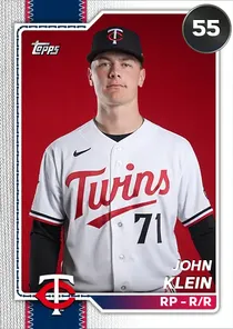 This is the Live card for John Klein, featured in MLB The Show 26. He's a 55 Overall Common card primarily playing RP. Available on the marketplace for around 5 stubs (buy now price). John Klein has a elite Meta Score of 53.53, indicating his overall effectiveness in competitive play. On the mound, John Klein exhibits below average H/9 with a 50 rating, below average K/9 with a 46 rating, and below average BB/9 with a 47 rating. His overall pitching profile is defined by below average control with a Control rating of 51, good velocity with a Velocity rating of 70, and below average break with a Break rating of 55. He utilizes a 5-pitch mix, spearheaded by a 4-Seam Fastball, complemented by a Curveball. Key pitches include: 4-Seam Fastball, Curveball, Slider, Knuckle, Cutter. John Klein is a 23-year-old baseball player, stands 6'5" and weighs 225 lbs, born in Minnesota, currently playing for the Twins, bats R and throws R.