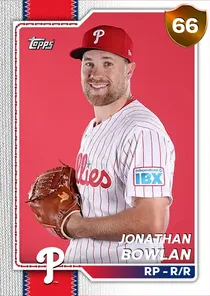 This is the Live card for Jonathan Bowlan, featured in MLB The Show 26. He's a 66 Overall Bronze card primarily playing RP. Available on the marketplace for around 25 stubs (buy now price). Jonathan Bowlan has a elite Meta Score of 65.52, indicating his overall effectiveness in competitive play. On the mound, Jonathan Bowlan exhibits below average H/9 with a 54 rating, average K/9 with a 64 rating, and below average BB/9 with a 53 rating. His overall pitching profile is defined by below average control with a Control rating of 50, elite velocity with a Velocity rating of 99, and elite break with a Break rating of 97. He utilizes a 5-pitch mix, spearheaded by a 4-Seam Fastball, complemented by a Slider. Key pitches include: 4-Seam Fastball, Slider, Sinker, Curveball, Circle Change. Jonathan Bowlan is a 29-year-old baseball player, stands 6'6" and weighs 240 lbs, born in Tennessee, currently playing for the Phillies, bats R and throws R. Other available versions for Jonathan Bowlan include: Live (64 Common).