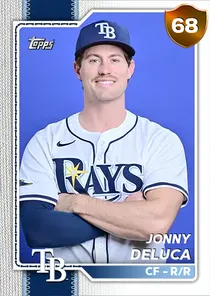 This is the Live card for Jonny DeLuca, featured in MLB The Show 26. He's a 68 Overall Bronze card primarily playing CF. He can also fill in at LF, RF. Available on the marketplace for around 25 stubs (buy now price). Jonny DeLuca has a elite Meta Score of 67.15, indicating his overall effectiveness in competitive play. At the plate, Jonny DeLuca displays below average contact overall, with specific ratings of 62 Contact vs Right and 43 Contact vs Left. He brings below average power to the plate, evident from his 40 Power vs Right and 34 Power vs Left. In terms of plate discipline, his average Vision stands at 62, paired with his below average Discipline rating of 48. In the field, Jonny DeLuca is a great defender. His key defensive attributes are 87 Fielding, 75 Arm Strength, and 76 Reaction time. On the basepaths, Jonny DeLuca showcases elite speed and average stealing ability. This is supported by 90 Speed, a 67 Stealing rating, and 82 Baserunning Aggression. Jonny DeLuca is a 27-year-old baseball player, stands 6'0" and weighs 200 lbs, born in California, currently playing for the Rays, bats R and throws R. Other available versions for Jonny DeLuca include: Live (75 Silver).
