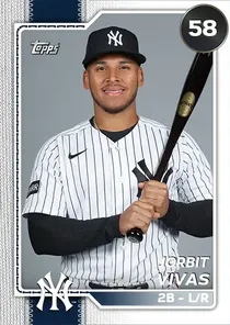 This is the Live card for Jorbit Vivas, featured in MLB The Show 26. He's a 58 Overall Common card primarily playing 2B. He can also fill in at 3B, SS. Available on the marketplace for around 12 stubs (sell now price). Jorbit Vivas has a elite Meta Score of 51.44, indicating his overall effectiveness in competitive play. At the plate, Jorbit Vivas displays below average contact overall, with specific ratings of 49 Contact vs Right and 44 Contact vs Left. He brings below average power to the plate, evident from his 44 Power vs Right and 32 Power vs Left. In terms of plate discipline, his average Vision stands at 60, paired with his below average Discipline rating of 50. In the field, Jorbit Vivas is a average defender. His key defensive attributes are 62 Fielding, 44 Arm Strength, and 63 Reaction time. Jorbit Vivas is a 25-year-old baseball player, stands 5'9" and weighs 171 lbs, born in Venezuela, currently playing for the Yankees, bats L and throws R. Other available versions for Jorbit Vivas include: Topps Now (88 Diamond), Live (64 Common).