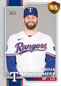 This is the Live card for Jordan Montgomery, featured in MLB The Show 26. He's a 65 Overall Bronze card primarily playing SP. Available on the marketplace for around 72 stubs (sell now price). Jordan Montgomery has a elite Meta Score of 60.67, indicating his overall effectiveness in competitive play. On the mound, Jordan Montgomery exhibits below average H/9 with a 46 rating, below average K/9 with a 48 rating, and average BB/9 with a 64 rating. His overall pitching profile is defined by below average control with a Control rating of 52, good velocity with a Velocity rating of 78, and average break with a Break rating of 68. He utilizes a 5-pitch mix, spearheaded by a Sinker, complemented by a 12-6 Curve. Key pitches include: Sinker, 12-6 Curve, Circle Change, 4-Seam Fastball, Slider. Jordan Montgomery is a 33-year-old baseball player, stands 6'6" and weighs 228 lbs, born in South Carolina, currently playing for the Rangers, bats L and throws L. Other available versions for Jordan Montgomery include: Postseason (83 Gold), Live (64 Common).