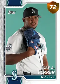 This is the Live card for Jose A. Ferrer, featured in MLB The Show 26. He's a 72 Overall Bronze card primarily playing RP. Available on the marketplace for around 41 stubs (sell now price). Jose A. Ferrer has a elite Meta Score of 71.77, indicating his overall effectiveness in competitive play. On the mound, Jose A. Ferrer exhibits average H/9 with a 64 rating, below average K/9 with a 55 rating, and great BB/9 with a 86 rating. His overall pitching profile is defined by good control with a Control rating of 74, elite velocity with a Velocity rating of 99, and elite break with a Break rating of 99. He utilizes a 4-pitch mix, spearheaded by a Sinker, complemented by a Circle Change. Key pitches include: Sinker, Circle Change, 4-Seam Fastball, Slider. Jose A. Ferrer is a 26-year-old baseball player, stands 6'1" and weighs 233 lbs, born in Dominican Republic, currently playing for the Mariners, bats L and throws L. Active Quirks for Jose A. Ferrer: Road Warrior, Outlier I. Other available versions for Jose A. Ferrer include: Live (69 Bronze).