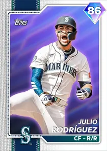 This is the Live card for Julio Rodríguez, featured in MLB The Show 26. He's a 86 Overall Diamond card primarily playing CF. Available on the marketplace for around 12,340 stubs (buy now price). Julio Rodríguez has a elite Meta Score of 82.04, indicating his overall effectiveness in competitive play. At the plate, Julio Rodríguez displays good contact overall, with specific ratings of 76 Contact vs Right and 76 Contact vs Left. He brings good power to the plate, evident from his 68 Power vs Right and 73 Power vs Left. In terms of plate discipline, his average Vision stands at 62, paired with his below average Discipline rating of 48. In the field, Julio Rodríguez is a elite defender. His key defensive attributes are 90 Fielding, 95 Arm Strength, and 75 Reaction time. On the basepaths, Julio Rodríguez showcases great speed and good stealing ability. This is supported by 86 Speed, a 70 Stealing rating, 0 Baserunning Ability, and 70 Baserunning Aggression. Julio Rodríguez is a 25-year-old baseball player, stands 6'3" and weighs 228 lbs, born in Dominican Republic, currently playing for the Mariners, bats R and throws R. Active Quirks for Julio Rodríguez: Road Warrior, First-Pitch Hitter, Dead Red, Unfazed, Day Player. Other available versions for Julio Rodríguez include: 2025 Postseason (99 Diamond), 2025 All-Star (96 Diamond), World Baseball Classic (91 Diamond), Live (88 Diamond).