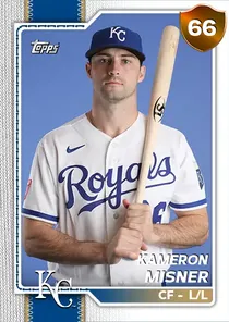 This is the Live card for Kameron Misner, featured in MLB The Show 26. He's a 66 Overall Bronze card primarily playing CF. He can also fill in at LF, RF. Available on the marketplace for around 25 stubs (buy now price). Kameron Misner has a elite Meta Score of 62.95, indicating his overall effectiveness in competitive play. At the plate, Kameron Misner displays below average contact overall, with specific ratings of 48 Contact vs Right and 37 Contact vs Left. He brings below average power to the plate, evident from his 48 Power vs Right and 41 Power vs Left. In terms of plate discipline, his below average Vision stands at 33, paired with his below average Discipline rating of 52. In the field, Kameron Misner is a great defender. His key defensive attributes are 80 Fielding, 82 Arm Strength, and 70 Reaction time. On the basepaths, Kameron Misner showcases good speed and average stealing ability. This is supported by 71 Speed, a 62 Stealing rating, and 63 Baserunning Aggression. Kameron Misner is a 28-year-old baseball player, stands 6'4" and weighs 220 lbs, born in Missouri, currently playing for the Royals, bats L and throws L. Other available versions for Kameron Misner include: Topps Now (86 Diamond), Live (76 Silver).