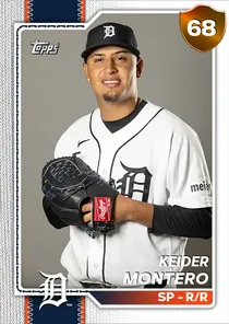This is the Live card for Keider Montero, featured in MLB The Show 26. He's a 68 Overall Bronze card primarily playing SP. Available on the marketplace for around 25 stubs (buy now price). Keider Montero has a elite Meta Score of 65.94, indicating his overall effectiveness in competitive play. On the mound, Keider Montero exhibits below average H/9 with a 50 rating, below average K/9 with a 48 rating, and average BB/9 with a 66 rating. His overall pitching profile is defined by average control with a Control rating of 61, elite velocity with a Velocity rating of 90, and elite break with a Break rating of 99. He utilizes a 5-pitch mix, spearheaded by a 4-Seam Fastball, complemented by a Slider. Key pitches include: 4-Seam Fastball, Slider, Sinker, Knuckle-curve, Circle Change. Keider Montero is a 25-year-old baseball player, stands 6'1" and weighs 145 lbs, born in Venezuela, currently playing for the Tigers, bats R and throws R. Other available versions for Keider Montero include: Live (69 Bronze).