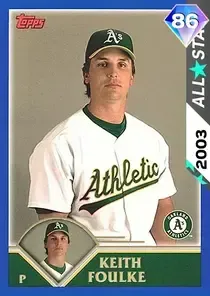 This is the All-Star card for Keith Foulke, featured in MLB The Show 26. He's a 86 Overall Diamond card primarily playing CP. Keith Foulke has a elite Meta Score of 84.34, indicating his overall effectiveness in competitive play. On the mound, Keith Foulke exhibits elite H/9 with a 97 rating, great K/9 with a 80 rating, and great BB/9 with a 84 rating. With runners threatening, his Pitching Clutch rating of 105 shows elite performance. His overall pitching profile is defined by below average control with a Control rating of 0, average velocity with a Velocity rating of 65, and elite break with a Break rating of 99. He utilizes a 4-pitch mix, spearheaded by a 4-Seam Fastball, complemented by a Changeup. Key pitches include: 4-Seam Fastball, Changeup, Curveball, Sinker. Keith Foulke is a 30-year-old baseball player, stands 6'3" and weighs 200 lbs, born in South Dakota, currently playing for the Athletics, bats R and throws R. Active Quirks for Keith Foulke: Homebody, Stopper, Day Player.