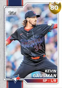 This is the Live card for Kevin Gausman, featured in MLB The Show 26. He's a 80 Overall Gold card primarily playing SP. Available on the marketplace for around 411 stubs (buy now price). Kevin Gausman has a elite Meta Score of 77.12, indicating his overall effectiveness in competitive play. On the mound, Kevin Gausman exhibits good H/9 with a 70 rating, average K/9 with a 63 rating, and good BB/9 with a 72 rating. His overall pitching profile is defined by average control with a Control rating of 68, elite velocity with a Velocity rating of 90, and elite break with a Break rating of 97. As a starting pitcher, his stamina is great with a rating of 86. He utilizes a 4-pitch mix, spearheaded by a 4-Seam Fastball, complemented by a Splitter. Key pitches include: 4-Seam Fastball, Splitter, Slider, Sinker. Kevin Gausman is a 35-year-old baseball player, stands 6'2" and weighs 205 lbs, born in Colorado, currently playing for the Blue Jays, bats L and throws R. Active Quirks for Kevin Gausman: Road Warrior, Break Outlier. Other available versions for Kevin Gausman include: 2025 Finest (99 Diamond), Pipeline Past (88 Diamond), Live (87 Diamond).