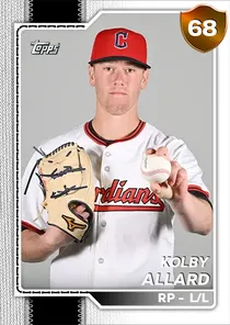 This is the Live card for Kolby Allard, featured in MLB The Show 26. He's a 68 Overall Bronze card primarily playing RP. Available on the marketplace for around 28 stubs (sell now price). Kolby Allard has a elite Meta Score of 68.14, indicating his overall effectiveness in competitive play. On the mound, Kolby Allard exhibits average H/9 with a 63 rating, below average K/9 with a 42 rating, and great BB/9 with a 82 rating. His overall pitching profile is defined by below average control with a Control rating of 59, good velocity with a Velocity rating of 70, and good break with a Break rating of 75. He utilizes a 5-pitch mix, spearheaded by a 4-Seam Fastball, complemented by a Curveball. Key pitches include: 4-Seam Fastball, Curveball, Cutter, Circle Change, Sinker. Kolby Allard is a 28-year-old baseball player, stands 6'1" and weighs 195 lbs, born in California, currently playing for the Free Agents, bats L and throws L. Other available versions for Kolby Allard include: Live (64 Common).