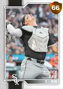 This is the Live card for Korey Lee, featured in MLB The Show 26. He's a 66 Overall Bronze card primarily playing C. Available on the marketplace for around 141 stubs (buy now price). Korey Lee has a elite Meta Score of 58.73, indicating his overall effectiveness in competitive play. At the plate, Korey Lee displays below average contact overall, with specific ratings of 42 Contact vs Right and 46 Contact vs Left. He brings below average power to the plate, evident from his 54 Power vs Right and 51 Power vs Left. In terms of plate discipline, his below average Vision stands at 48, paired with his below average Discipline rating of 39. In the field, Korey Lee is a below average defender. His key defensive attributes are 51 Fielding, 89 Arm Strength, and 0 Reaction time. On the basepaths, Korey Lee showcases below average speed and below average stealing ability. This is supported by 59 Speed, a 16 Stealing rating, and 18 Baserunning Aggression. Korey Lee is a 27-year-old baseball player, stands 6'0" and weighs 225 lbs, born in California, currently playing for the White Sox, bats R and throws R. Other available versions for Korey Lee include: Live (70 Bronze).