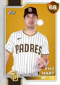 This is the Live card for Kyle Hart, featured in MLB The Show 26. He's a 68 Overall Bronze card primarily playing RP. Available on the marketplace for around 40 stubs (sell now price). Kyle Hart has a elite Meta Score of 66.74, indicating his overall effectiveness in competitive play. On the mound, Kyle Hart exhibits average H/9 with a 69 rating, below average K/9 with a 51 rating, and average BB/9 with a 67 rating. His overall pitching profile is defined by below average control with a Control rating of 46, good velocity with a Velocity rating of 76, and elite break with a Break rating of 90. He utilizes a 5-pitch mix, spearheaded by a Sweeper, complemented by a Sinker. Key pitches include: Sweeper, Sinker, 4-Seam Fastball, Circle Change, Slider. Kyle Hart is a 33-year-old baseball player, stands 6'5" and weighs 200 lbs, born in Ohio, currently playing for the Padres, bats L and throws L. Active Quirks for Kyle Hart: Stopper. Other available versions for Kyle Hart include: Live (60 Common).