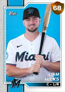 This is the Live card for Liam Hicks, featured in MLB The Show 26. He's a 68 Overall Bronze card primarily playing C. He can also fill in at 1B. Available on the marketplace for around 136 stubs (buy now price). Liam Hicks has a elite Meta Score of 61.37, indicating his overall effectiveness in competitive play. At the plate, Liam Hicks displays below average contact overall, with specific ratings of 68 Contact vs Right and 38 Contact vs Left. He brings below average power to the plate, evident from his 46 Power vs Right and 35 Power vs Left. In terms of plate discipline, his great Vision stands at 82, paired with his good Discipline rating of 78. In the field, Liam Hicks is a below average defender. His key defensive attributes are 59 Fielding, 61 Arm Strength, and 60 Reaction time. Liam Hicks is a 26-year-old baseball player, stands 5'9" and weighs 185 lbs, born in Canada, currently playing for the Marlins, bats L and throws R. Other available versions for Liam Hicks include: Live (77 Silver).