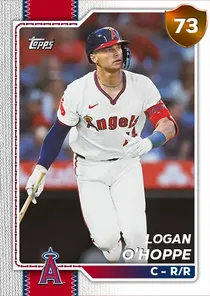 This is the Live card for Logan O'Hoppe, featured in MLB The Show 26. He's a 73 Overall Bronze card primarily playing C. Available on the marketplace for around 30 stubs (buy now price). Logan O'Hoppe has a elite Meta Score of 62.12, indicating his overall effectiveness in competitive play. At the plate, Logan O'Hoppe displays below average contact overall, with specific ratings of 58 Contact vs Right and 54 Contact vs Left. He brings good power to the plate, evident from his 72 Power vs Right and 75 Power vs Left. In terms of plate discipline, his below average Vision stands at 47, paired with his below average Discipline rating of 46. In the field, Logan O'Hoppe is a below average defender. His key defensive attributes are 51 Fielding, 78 Arm Strength, and 0 Reaction time. On the basepaths, Logan O'Hoppe showcases below average speed and below average stealing ability. This is supported by 54 Speed, a 8 Stealing rating, and 16 Baserunning Aggression. Logan O'Hoppe is a 26-year-old baseball player, stands 6'2" and weighs 185 lbs, born in New York, currently playing for the Angels, bats R and throws R. Other available versions for Logan O'Hoppe include: Neon (99 Diamond), Topps Now (92 Diamond), Egg Hunt (87 Diamond), Live (78 Silver).