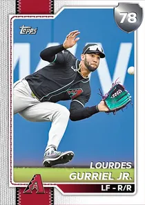 This is the Live card for Lourdes Gurriel Jr., featured in MLB The Show 26. He's a 78 Overall Silver card primarily playing LF. Available on the marketplace for around 131 stubs (buy now price). Lourdes Gurriel Jr. has a elite Meta Score of 67.30, indicating his overall effectiveness in competitive play. At the plate, Lourdes Gurriel Jr. displays good contact overall, with specific ratings of 56 Contact vs Right and 88 Contact vs Left. He brings average power to the plate, evident from his 60 Power vs Right and 60 Power vs Left. In terms of plate discipline, his good Vision stands at 76, paired with his below average Discipline rating of 43. In the field, Lourdes Gurriel Jr. is a average defender. His key defensive attributes are 64 Fielding, 67 Arm Strength, and 64 Reaction time. On the basepaths, Lourdes Gurriel Jr. showcases below average speed and below average stealing ability. This is supported by 51 Speed, a 40 Stealing rating, and 51 Baserunning Aggression. Lourdes Gurriel Jr. is a 32-year-old baseball player, stands 6'3" and weighs 215 lbs, born in Cuba, currently playing for the Diamondbacks, bats R and throws R. Active Quirks for Lourdes Gurriel Jr.: Breaking Ball Hitter, Bad Ball Hitter. Other available versions for Lourdes Gurriel Jr. include: Topps Now (97 Diamond), Color Storm (91 Diamond), Live (79 Silver).