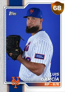 This is the Live card for Luis García, featured in MLB The Show 26. He's a 68 Overall Bronze card primarily playing RP. Available on the marketplace for around 25 stubs (buy now price). Luis García has a elite Meta Score of 66.66, indicating his overall effectiveness in competitive play. On the mound, Luis García exhibits below average H/9 with a 56 rating, below average K/9 with a 55 rating, and average BB/9 with a 63 rating. His overall pitching profile is defined by average control with a Control rating of 61, elite velocity with a Velocity rating of 99, and good break with a Break rating of 76. He utilizes a 5-pitch mix, spearheaded by a Sinker, complemented by a Sweeper. Key pitches include: Sinker, Sweeper, Splitter, 4-Seam Fastball, Slider. Luis García is a 39-year-old baseball player, stands 6'2" and weighs 240 lbs, born in Dominican Republic, currently playing for the Mets, bats R and throws R. Active Quirks for Luis García: Road Warrior. Other available versions for Luis García include: Topps Now (97 Diamond), Live (78 Silver), Live (76 Silver), Live (72 Bronze).