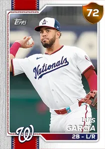 This is the Live card for Luis García, featured in MLB The Show 26. He's a 72 Overall Bronze card primarily playing 2B. Available on the marketplace for around 105 stubs (buy now price). Luis García has a elite Meta Score of 63.89, indicating his overall effectiveness in competitive play. At the plate, Luis García displays average contact overall, with specific ratings of 78 Contact vs Right and 51 Contact vs Left. He brings below average power to the plate, evident from his 61 Power vs Right and 30 Power vs Left. In terms of plate discipline, his great Vision stands at 81, paired with his below average Discipline rating of 41. In the field, Luis García is a average defender. His key defensive attributes are 62 Fielding, 45 Arm Strength, and 62 Reaction time. On the basepaths, Luis García showcases below average speed and below average stealing ability. This is supported by 41 Speed, a 54 Stealing rating, and 67 Baserunning Aggression. Luis García is a 25-year-old baseball player, stands 6'1" and weighs 216 lbs, born in New York, currently playing for the Nationals, bats L and throws R. Active Quirks for Luis García: Bad Ball Hitter, Pinch Hitter. Other available versions for Luis García include: Topps Now (97 Diamond), Live (78 Silver), Live (76 Silver), Live (68 Bronze).