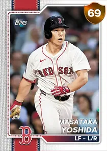 This is the Live card for Masataka Yoshida, featured in MLB The Show 26. He's a 69 Overall Bronze card primarily playing LF. Available on the marketplace for around 25 stubs (buy now price). Masataka Yoshida has a elite Meta Score of 56.19, indicating his overall effectiveness in competitive play. At the plate, Masataka Yoshida displays average contact overall, with specific ratings of 88 Contact vs Right and 40 Contact vs Left. He brings below average power to the plate, evident from his 52 Power vs Right and 41 Power vs Left. In terms of plate discipline, his elite Vision stands at 90, paired with his below average Discipline rating of 46. On the basepaths, Masataka Yoshida showcases below average speed and below average stealing ability. This is supported by 40 Speed, a 15 Stealing rating, 0 Baserunning Ability, and 10 Baserunning Aggression. Masataka Yoshida is a 32-year-old baseball player, stands 5'8" and weighs 192 lbs, born in Japan, currently playing for the Red Sox, bats L and throws R. Other available versions for Masataka Yoshida include: 2025 Postseason (99 Diamond), Color Storm (91 Diamond), World Baseball Classic (86 Diamond), Live (70 Bronze).