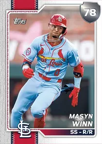 This is the Live card for Masyn Winn, featured in MLB The Show 26. He's a 78 Overall Silver card primarily playing SS. Available on the marketplace for around 127 stubs (buy now price). Masyn Winn has a elite Meta Score of 77.64, indicating his overall effectiveness in competitive play. At the plate, Masyn Winn displays average contact overall, with specific ratings of 66 Contact vs Right and 64 Contact vs Left. He brings below average power to the plate, evident from his 43 Power vs Right and 55 Power vs Left. In terms of plate discipline, his good Vision stands at 75, paired with his below average Discipline rating of 49. In the field, Masyn Winn is a elite defender. His key defensive attributes are 99 Fielding, 85 Arm Strength, and 74 Reaction time. On the basepaths, Masyn Winn showcases good speed and below average stealing ability. This is supported by 73 Speed, a 30 Stealing rating, and 55 Baserunning Aggression. Masyn Winn is a 23-year-old baseball player, stands 5'9" and weighs 185 lbs, born in Texas, currently playing for the Cardinals, bats R and throws R. Active Quirks for Masyn Winn: Bad Ball Hitter. Other available versions for Masyn Winn include: Moonshot (89 Diamond), Live (83 Gold).