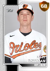 This is the Live card for Matt Bowman, featured in MLB The Show 26. He's a 68 Overall Bronze card primarily playing RP. Available on the marketplace for around 30 stubs (sell now price). Matt Bowman has a elite Meta Score of 66.43, indicating his overall effectiveness in competitive play. On the mound, Matt Bowman exhibits good H/9 with a 71 rating, below average K/9 with a 45 rating, and good BB/9 with a 71 rating. His overall pitching profile is defined by below average control with a Control rating of 47, average velocity with a Velocity rating of 69, and great break with a Break rating of 85. He utilizes a 5-pitch mix, spearheaded by a Sinker, complemented by a Cutter. Key pitches include: Sinker, Cutter, Sweeper, Splitter, 4-Seam Fastball. Matt Bowman is a 34-year-old baseball player, stands 6'0" and weighs 185 lbs, born in Maryland, currently playing for the Free Agents, bats R and throws R. Other available versions for Matt Bowman include: Live (66 Bronze).