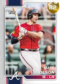 This is the Live card for Matt Olson, featured in MLB The Show 26. He's a 82 Overall Gold card primarily playing 1B. Available on the marketplace for around 1,015 stubs (sell now price). Matt Olson has a elite Meta Score of 79.20, indicating his overall effectiveness in competitive play. At the plate, Matt Olson displays good contact overall, with specific ratings of 74 Contact vs Right and 76 Contact vs Left. He brings good power to the plate, evident from his 80 Power vs Right and 73 Power vs Left. In terms of plate discipline, his below average Vision stands at 56, paired with his great Discipline rating of 81. In the field, Matt Olson is a great defender. His key defensive attributes are 81 Fielding, 38 Arm Strength, and 70 Reaction time. Matt Olson is a 31-year-old baseball player, stands 6'4" and weighs 225 lbs, born in Georgia, currently playing for the Braves, bats L and throws R. Active Quirks for Matt Olson: Road Warrior, Dead Red, Unfazed, Rally Monkey, Bad Ball Hitter, Situational Hitter, Night Player, Table Setter. Other available versions for Matt Olson include: Milestone (99 Diamond), 2025 Home Run Derby (96 Diamond), 2025 All-Star (96 Diamond), Live (81 Gold).