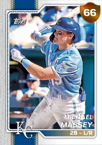 This is the Live card for Michael Massey, featured in MLB The Show 26. He's a 66 Overall Bronze card primarily playing 2B. Available on the marketplace for around 64 stubs (sell now price). Michael Massey has a elite Meta Score of 57.33, indicating his overall effectiveness in competitive play. At the plate, Michael Massey displays average contact overall, with specific ratings of 61 Contact vs Right and 60 Contact vs Left. He brings below average power to the plate, evident from his 48 Power vs Right and 36 Power vs Left. In terms of plate discipline, his good Vision stands at 76, paired with his below average Discipline rating of 33. In the field, Michael Massey is a good defender. His key defensive attributes are 78 Fielding, 42 Arm Strength, and 70 Reaction time. Michael Massey is a 27-year-old baseball player, stands 6'0" and weighs 195 lbs, born in Illinois, currently playing for the Royals, bats L and throws R. Other available versions for Michael Massey include: Live (70 Bronze).