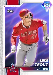 This is the Live card for Mike Trout, featured in MLB The Show 26. He's a 85 Overall Diamond card primarily playing CF. He can also fill in at RF. Available on the marketplace for around 20,255 stubs (buy now price). Mike Trout has a elite Meta Score of 72.37, indicating his overall effectiveness in competitive play. At the plate, Mike Trout displays good contact overall, with specific ratings of 70 Contact vs Right and 77 Contact vs Left. He brings elite power to the plate, evident from his 106 Power vs Right and 77 Power vs Left. In terms of plate discipline, his below average Vision stands at 45, paired with his elite Discipline rating of 103. In the field, Mike Trout is a good defender. His key defensive attributes are 70 Fielding, 75 Arm Strength, and 69 Reaction time. On the basepaths, Mike Trout showcases average speed and below average stealing ability. This is supported by 64 Speed, a 26 Stealing rating, and 27 Baserunning Aggression. Mike Trout is a 34-year-old baseball player, stands 6'2" and weighs 235 lbs, born in New Jersey, currently playing for the Angels, bats R and throws R. Active Quirks for Mike Trout: Homebody, Dead Red, Day Player. Other available versions for Mike Trout include: Milestone (99 Diamond), Rookie (95 Diamond), Live (85 Diamond), Topps Now (79 Silver).