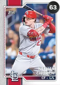 This is the Live card for Nathan Church, featured in MLB The Show 26. He's a 63 Overall Common card primarily playing CF. He can also fill in at LF, RF. Available on the marketplace for around 9 stubs (buy now price). Nathan Church has a elite Meta Score of 60.35, indicating his overall effectiveness in competitive play. At the plate, Nathan Church displays below average contact overall, with specific ratings of 36 Contact vs Right and 45 Contact vs Left. He brings below average power to the plate, evident from his 37 Power vs Right and 36 Power vs Left. In terms of plate discipline, his below average Vision stands at 45, paired with his below average Discipline rating of 33. In the field, Nathan Church is a good defender. His key defensive attributes are 75 Fielding, 91 Arm Strength, and 72 Reaction time. On the basepaths, Nathan Church showcases good speed and below average stealing ability. This is supported by 77 Speed, a 34 Stealing rating, and 44 Baserunning Aggression. Nathan Church is a 25-year-old baseball player, stands 5'10" and weighs 180 lbs, born in California, currently playing for the Cardinals, bats L and throws L. Other available versions for Nathan Church include: Live (63 Common).