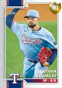 This is the Live card for Nathan Eovaldi, featured in MLB The Show 26. He's a 81 Overall Gold card primarily playing SP. Available on the marketplace for around 600 stubs (buy now price). Nathan Eovaldi has a elite Meta Score of 79.41, indicating his overall effectiveness in competitive play. On the mound, Nathan Eovaldi exhibits good H/9 with a 73 rating, average K/9 with a 60 rating, and good BB/9 with a 76 rating. His overall pitching profile is defined by good control with a Control rating of 74, great velocity with a Velocity rating of 88, and elite break with a Break rating of 94. As a starting pitcher, his stamina is great with a rating of 86. He utilizes a 5-pitch mix, spearheaded by a Splitter, complemented by a 4-Seam Fastball. Key pitches include: Splitter, 4-Seam Fastball, Cutter, Curveball, Sinker. Nathan Eovaldi is a 36-year-old baseball player, stands 6'2" and weighs 217 lbs, born in Texas, currently playing for the Rangers, bats R and throws R. Active Quirks for Nathan Eovaldi: Road Warrior, Stopper, Night Player, Break Outlier. Other available versions for Nathan Eovaldi include: 2025 Finest (99 Diamond), Spotlight (93 Diamond), Live (87 Diamond).