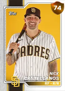 This is the Live card for Nick Castellanos, featured in MLB The Show 26. He's a 74 Overall Bronze card primarily playing RF. He can also fill in at 1B. Available on the marketplace for around 25 stubs (buy now price). Nick Castellanos has a elite Meta Score of 62.50, indicating his overall effectiveness in competitive play. At the plate, Nick Castellanos displays average contact overall, with specific ratings of 66 Contact vs Right and 68 Contact vs Left. He brings average power to the plate, evident from his 55 Power vs Right and 69 Power vs Left. In terms of plate discipline, his average Vision stands at 66, paired with his below average Discipline rating of 46. On the basepaths, Nick Castellanos showcases average speed and below average stealing ability. This is supported by 61 Speed, a 30 Stealing rating, and 24 Baserunning Aggression. Nick Castellanos is a 34-year-old baseball player, stands 6'3" and weighs 203 lbs, born in Florida, currently playing for the Padres, bats R and throws R. Active Quirks for Nick Castellanos: First-Pitch Hitter. Other available versions for Nick Castellanos include: Captain (99 Diamond), Summer (93 Diamond), Topps Now (83 Gold), Live (71 Bronze).