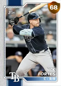 This is the Live card for Nick Fortes, featured in MLB The Show 26. He's a 68 Overall Bronze card primarily playing C. Available on the marketplace for around 26 stubs (buy now price). Nick Fortes has a elite Meta Score of 65.69, indicating his overall effectiveness in competitive play. At the plate, Nick Fortes displays below average contact overall, with specific ratings of 46 Contact vs Right and 51 Contact vs Left. He brings below average power to the plate, evident from his 44 Power vs Right and 36 Power vs Left. In terms of plate discipline, his great Vision stands at 80, paired with his below average Discipline rating of 36. In the field, Nick Fortes is a good defender. His key defensive attributes are 73 Fielding, 70 Arm Strength, and 0 Reaction time. On the basepaths, Nick Fortes showcases below average speed and below average stealing ability. This is supported by 46 Speed, a 2 Stealing rating, and 4 Baserunning Aggression. Nick Fortes is a 29-year-old baseball player, stands 5'11" and weighs 198 lbs, born in Florida, currently playing for the Rays, bats R and throws R. Other available versions for Nick Fortes include: Live (76 Silver).