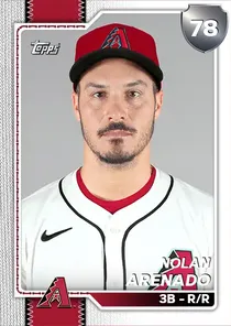 This is the Live card for Nolan Arenado, featured in MLB The Show 26. He's a 78 Overall Silver card primarily playing 3B. Available on the marketplace for around 130 stubs (buy now price). Nolan Arenado has a elite Meta Score of 71.26, indicating his overall effectiveness in competitive play. At the plate, Nolan Arenado displays good contact overall, with specific ratings of 73 Contact vs Right and 69 Contact vs Left. He brings below average power to the plate, evident from his 60 Power vs Right and 56 Power vs Left. In terms of plate discipline, his great Vision stands at 88, paired with his below average Discipline rating of 51. In the field, Nolan Arenado is a great defender. His key defensive attributes are 82 Fielding, 61 Arm Strength, and 72 Reaction time. Nolan Arenado is a 34-year-old baseball player, stands 6'2" and weighs 215 lbs, born in California, currently playing for the Diamondbacks, bats R and throws R. Other available versions for Nolan Arenado include: Ranked 1000 (99 Diamond), Finest (99 Diamond), Spotlight (95 Diamond), World Baseball Classic (89 Diamond), Live (78 Silver).