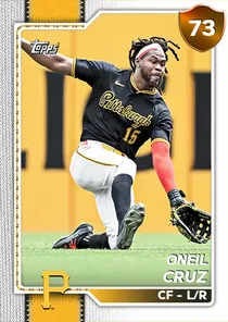 This is the Live card for Oneil Cruz, featured in MLB The Show 26. He's a 73 Overall Bronze card primarily playing CF. He can also fill in at SS. Available on the marketplace for around 45 stubs (buy now price). Oneil Cruz has a elite Meta Score of 67.06, indicating his overall effectiveness in competitive play. At the plate, Oneil Cruz displays below average contact overall, with specific ratings of 65 Contact vs Right and 26 Contact vs Left. He brings average power to the plate, evident from his 69 Power vs Right and 52 Power vs Left. In terms of plate discipline, his below average Vision stands at 38, paired with his good Discipline rating of 72. In the field, Oneil Cruz is a good defender. His key defensive attributes are 70 Fielding, 99 Arm Strength, and 65 Reaction time. On the basepaths, Oneil Cruz showcases great speed and great stealing ability. This is supported by 86 Speed, a 87 Stealing rating, 0 Baserunning Ability, and 80 Baserunning Aggression. Oneil Cruz is a 27-year-old baseball player, stands 6'7" and weighs 240 lbs, born in Dominican Republic, currently playing for the Pirates, bats L and throws R. Active Quirks for Oneil Cruz: First-Pitch Hitter. Other available versions for Oneil Cruz include: Captain (99 Diamond), 2025 Home Run Derby (98 Diamond), Spotlight (91 Diamond), World Baseball Classic (87 Diamond), Live (80 Gold).
