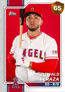 This is the Live card for Oswald Peraza, featured in MLB The Show 26. He's a 65 Overall Bronze card primarily playing SS. He can also fill in at 1B, 2B, 3B. Available on the marketplace for around 28 stubs (buy now price). Oswald Peraza has a elite Meta Score of 62.16, indicating his overall effectiveness in competitive play. At the plate, Oswald Peraza displays below average contact overall, with specific ratings of 34 Contact vs Right and 25 Contact vs Left. He brings below average power to the plate, evident from his 48 Power vs Right and 37 Power vs Left. In terms of plate discipline, his below average Vision stands at 48, paired with his below average Discipline rating of 50. In the field, Oswald Peraza is a good defender. His key defensive attributes are 74 Fielding, 80 Arm Strength, and 68 Reaction time. On the basepaths, Oswald Peraza showcases great speed and below average stealing ability. This is supported by 85 Speed, a 52 Stealing rating, and 57 Baserunning Aggression. Oswald Peraza is a 25-year-old baseball player, stands 5'11" and weighs 200 lbs, born in Venezuela, currently playing for the Angels, bats R and throws R. Other available versions for Oswald Peraza include: Live (68 Bronze).