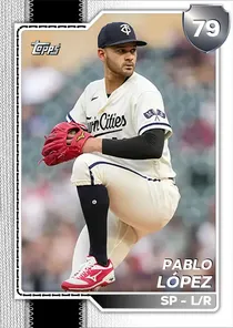 This is the Live card for Pablo López, featured in MLB The Show 26. He's a 79 Overall Silver card primarily playing SP. Available on the marketplace for around 165 stubs (buy now price). Pablo López has a elite Meta Score of 73.54, indicating his overall effectiveness in competitive play. On the mound, Pablo López exhibits average H/9 with a 62 rating, average K/9 with a 64 rating, and great BB/9 with a 80 rating. His overall pitching profile is defined by average control with a Control rating of 65, elite velocity with a Velocity rating of 90, and good break with a Break rating of 77. As a starting pitcher, his stamina is great with a rating of 83. He utilizes a 5-pitch mix, spearheaded by a 4-Seam Fastball, complemented by a Sweeper. Key pitches include: 4-Seam Fastball, Sweeper, Circle Change, Curveball, Sinker. Pablo López is a 30-year-old baseball player, stands 6'4" and weighs 225 lbs, born in Venezuela, currently playing for the Free Agents, bats L and throws R. Active Quirks for Pablo López: Homebody, Night Player. Other available versions for Pablo López include: Live (82 Gold).