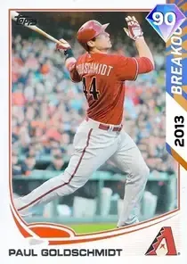This is the Breakout card for Paul Goldschmidt, featured in MLB The Show 26. He's a 90 Overall Diamond card primarily playing 1B. Paul Goldschmidt has a elite Meta Score of 88.04, indicating his overall effectiveness in competitive play. At the plate, Paul Goldschmidt displays great contact overall, with specific ratings of 82 Contact vs Right and 90 Contact vs Left. He brings great power to the plate, evident from his 72 Power vs Right and 92 Power vs Left. In terms of plate discipline, his average Vision stands at 60, paired with his elite Discipline rating of 95. In the field, Paul Goldschmidt is a good defender. His key defensive attributes are 75 Fielding, 46 Arm Strength, and 66 Reaction time. On the basepaths, Paul Goldschmidt showcases average speed and below average stealing ability. This is supported by 60 Speed, a 45 Stealing rating, and 58 Baserunning Aggression. Paul Goldschmidt is a 25-year-old baseball player, stands 6'3" and weighs 230 lbs, born in Delaware, currently playing for the Diamondbacks, bats R and throws R. Active Quirks for Paul Goldschmidt: Road Warrior, First-Pitch Hitter, Dead Red, Fighter, Situational Hitter, Night Player. Other available versions for Paul Goldschmidt include: Finest (99 Diamond), New Threads (86 Diamond), Live (78 Silver), Live (76 Silver).