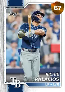 This is the Live card for Richie Palacios, featured in MLB The Show 26. He's a 67 Overall Bronze card primarily playing LF. He can also fill in at 2B, 3B, CF, RF. Available on the marketplace for around 27 stubs (buy now price). Richie Palacios has a elite Meta Score of 56.60, indicating his overall effectiveness in competitive play. At the plate, Richie Palacios displays average contact overall, with specific ratings of 56 Contact vs Right and 72 Contact vs Left. He brings below average power to the plate, evident from his 47 Power vs Right and 35 Power vs Left. In terms of plate discipline, his average Vision stands at 63, paired with his great Discipline rating of 85. In the field, Richie Palacios is a below average defender. His key defensive attributes are 52 Fielding, 62 Arm Strength, and 60 Reaction time. On the basepaths, Richie Palacios showcases below average speed and average stealing ability. This is supported by 44 Speed, a 62 Stealing rating, and 73 Baserunning Aggression. Richie Palacios is a 28-year-old baseball player, stands 5'10" and weighs 180 lbs, born in New York, currently playing for the Rays, bats L and throws R. Other available versions for Richie Palacios include: Live (74 Bronze).