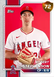 This is the Live card for Robert Stephenson, featured in MLB The Show 26. He's a 72 Overall Bronze card primarily playing CP. Available on the marketplace for around 28 stubs (buy now price). Robert Stephenson has a elite Meta Score of 67.40, indicating his overall effectiveness in competitive play. On the mound, Robert Stephenson exhibits good H/9 with a 76 rating, below average K/9 with a 56 rating, and average BB/9 with a 67 rating. His overall pitching profile is defined by below average control with a Control rating of 51, great velocity with a Velocity rating of 85, and elite break with a Break rating of 93. He utilizes a 4-pitch mix, spearheaded by a Cutter, complemented by a 4-Seam Fastball. Key pitches include: Cutter, 4-Seam Fastball, Splitter, Slider. Robert Stephenson is a 33-year-old baseball player, stands 6'3" and weighs 205 lbs, born in California, currently playing for the Angels, bats R and throws R. Other available versions for Robert Stephenson include: Live (72 Bronze).
