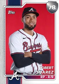 This is the Live card for Robert Suarez, featured in MLB The Show 26. He's a 78 Overall Silver card primarily playing RP. Available on the marketplace for around 131 stubs (buy now price). Robert Suarez has a elite Meta Score of 77.23, indicating his overall effectiveness in competitive play. On the mound, Robert Suarez exhibits great H/9 with a 88 rating, average K/9 with a 64 rating, and good BB/9 with a 78 rating. His overall pitching profile is defined by good control with a Control rating of 72, elite velocity with a Velocity rating of 99, and elite break with a Break rating of 91. He utilizes a 4-pitch mix, spearheaded by a 4-Seam Fastball, complemented by a Circle Change. Key pitches include: 4-Seam Fastball, Circle Change, Sinker, Cutter. Robert Suarez is a 35-year-old baseball player, stands 6'2" and weighs 210 lbs, born in Venezuela, currently playing for the Braves, bats R and throws R. Active Quirks for Robert Suarez: Homebody. Other available versions for Robert Suarez include: 2025 All-Star (96 Diamond), Live (81 Gold).