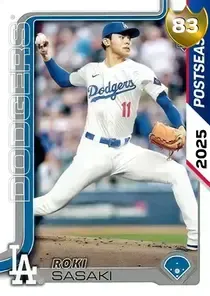 This is the Postseason card for Roki Sasaki, featured in MLB The Show 26. He's a 83 Overall Gold card primarily playing CP. Roki Sasaki has a elite Meta Score of 81.61, indicating his overall effectiveness in competitive play. On the mound, Roki Sasaki exhibits elite H/9 with a 96 rating, good K/9 with a 78 rating, and below average BB/9 with a 47 rating. With runners threatening, his Pitching Clutch rating of 109 shows elite performance. His overall pitching profile is defined by below average control with a Control rating of 0, elite velocity with a Velocity rating of 99, and elite break with a Break rating of 99. He utilizes a 4-pitch mix, spearheaded by a 4-Seam Fastball, complemented by a Splitter. Key pitches include: 4-Seam Fastball, Splitter, Sinker, Slider. Roki Sasaki is a 23-year-old baseball player, stands 6'2" and weighs 187 lbs, born in Japan, currently playing for the Dodgers, bats R and throws R. Active Quirks for Roki Sasaki: Road Warrior, Stopper, Day Player. Other available versions for Roki Sasaki include: 2025 Postseason (99 Diamond), Pipeline (88 Diamond), Live (79 Silver), Live (72 Bronze).