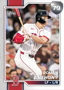 This is the Live card for Roman Anthony, featured in MLB The Show 26. He's a 79 Overall Silver card primarily playing LF. He can also fill in at CF, RF. Available on the marketplace for around 660 stubs (buy now price). Roman Anthony has a elite Meta Score of 72.36, indicating his overall effectiveness in competitive play. At the plate, Roman Anthony displays great contact overall, with specific ratings of 84 Contact vs Right and 78 Contact vs Left. He brings below average power to the plate, evident from his 54 Power vs Right and 64 Power vs Left. In terms of plate discipline, his below average Vision stands at 49, paired with his great Discipline rating of 81. In the field, Roman Anthony is a great defender. His key defensive attributes are 87 Fielding, 65 Arm Strength, and 72 Reaction time. On the basepaths, Roman Anthony showcases average speed and below average stealing ability. This is supported by 62 Speed, a 21 Stealing rating, 0 Baserunning Ability, and 22 Baserunning Aggression. Roman Anthony is a 21-year-old baseball player, stands 6'3" and weighs 200 lbs, born in Florida, currently playing for the Red Sox, bats L and throws R. Active Quirks for Roman Anthony: Road Warrior, Dead Red, Fighter, Day Player, Table Setter. Other available versions for Roman Anthony include: Spotlight (99 Diamond), Topps Now (92 Diamond), World Baseball Classic (89 Diamond), Pipeline (87 Diamond), Live (81 Gold).