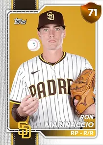 This is the Live card for Ron Marinaccio, featured in MLB The Show 26. He's a 71 Overall Bronze card primarily playing RP. Available on the marketplace for around 33 stubs (sell now price). Ron Marinaccio has a elite Meta Score of 68.99, indicating his overall effectiveness in competitive play. On the mound, Ron Marinaccio exhibits good H/9 with a 74 rating, good K/9 with a 70 rating, and below average BB/9 with a 42 rating. With runners threatening, his Pitching Clutch rating of 87 shows great performance. His overall pitching profile is defined by below average control with a Control rating of 49, good velocity with a Velocity rating of 74, and elite break with a Break rating of 90. He utilizes a 4-pitch mix, spearheaded by a 4-Seam Fastball, complemented by a Circle Change. Key pitches include: 4-Seam Fastball, Circle Change, Cutter, Sweeper. Ron Marinaccio is a 30-year-old baseball player, stands 6'2" and weighs 205 lbs, born in New Jersey, currently playing for the Padres, bats R and throws R. Other available versions for Ron Marinaccio include: Live (71 Bronze).